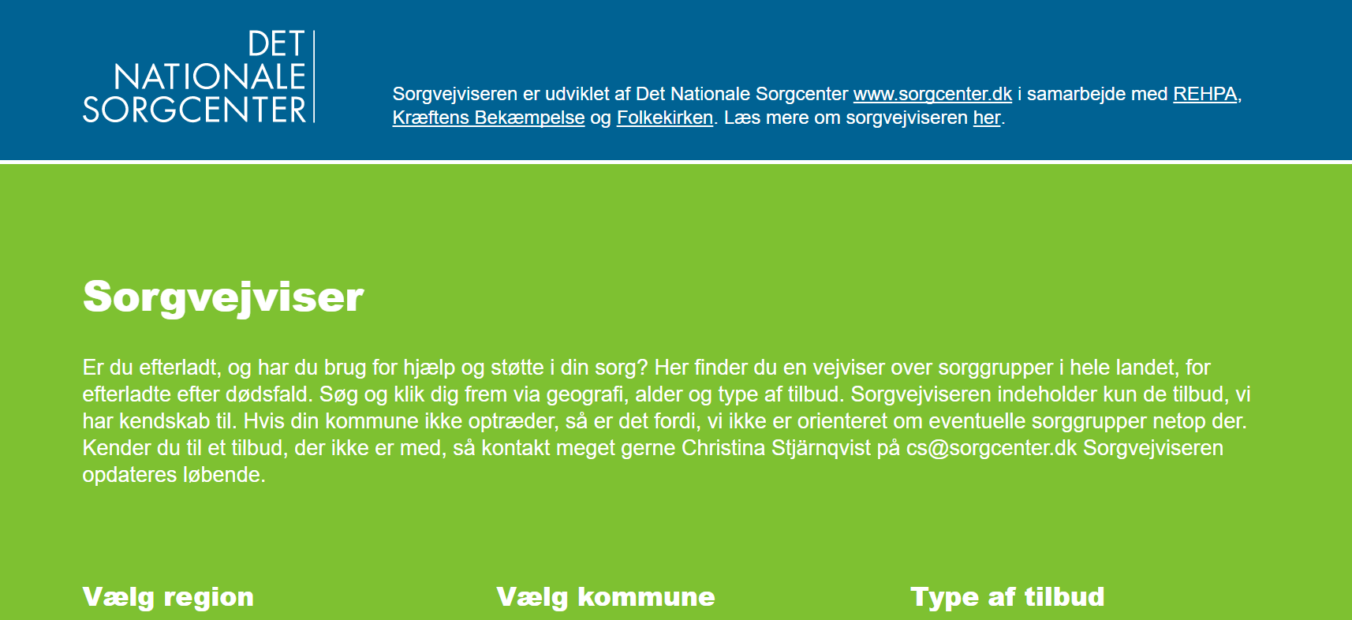 Mange efterladte farer vild i livet og får brug for støtte og hjælp, når de mister en nærtstående og bliver ramt af sorg. Derfor lancerer Det Nationale Sorgcenter nu en ny elektronisk sorgvejviser på internettet, som samler og giver et overblik over alle gratis støtte- og hjælpetilbud til sorgramte i Danmark. Sorgvejviseren er udviklet i samarbejde med REHPA – Videncenter for Rehabilitering og Palliation, Kræftens Bekæmpelse og Folkekirken.