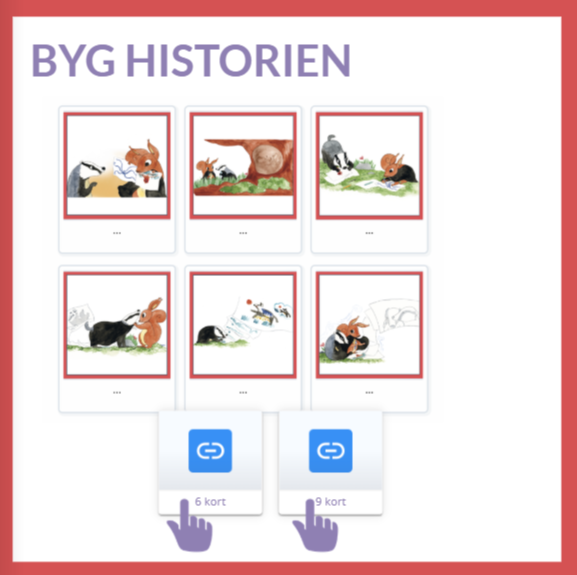 Indhold: Interaktivt element hvor eleverne skal placere billederne i rækkefølge og genskabe historien. Elementet findes i to versioner med henholdsvis 6 og 9 kort.