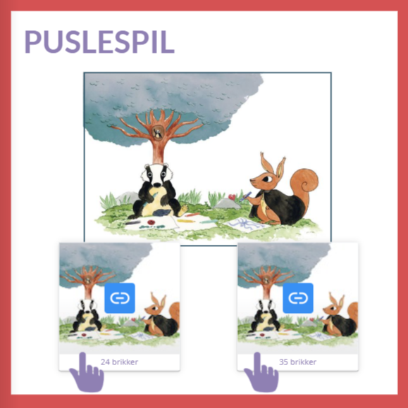 Vejledning: Eleverne skal samle puslespillet som optakt til en fælles samtale om, hvad der sker på billedet. På puslespillet ses Grævling siddende op ad træet. Han sidder og tegner sammen med Knirke.