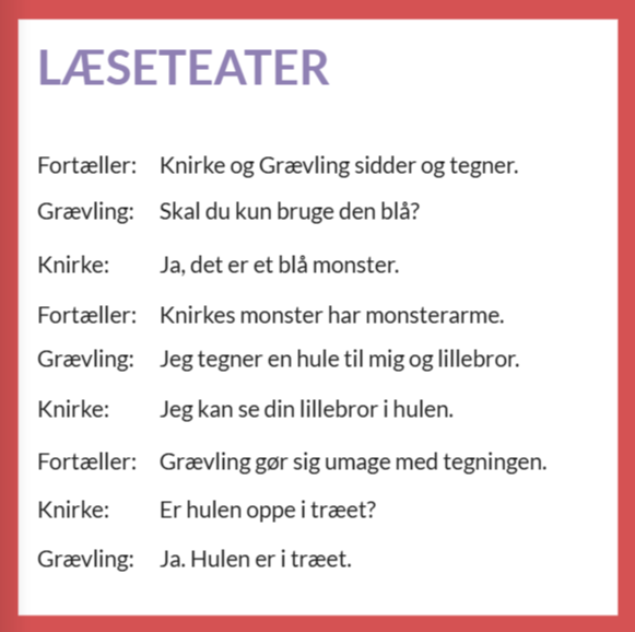 Vejledning: Eleverne arbejder med læseteateret i små grupper eller i fællesskab i klassen. Rollerne fordeles mellem eleverne, og teksten kan læses højt, indtales eller opføres med støtte i enkle kropslige udtryk, bevægelser og mimik.