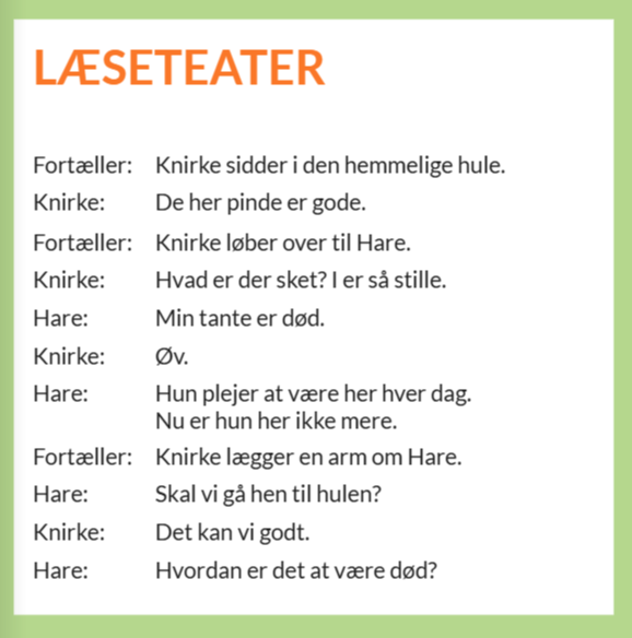 Vejledning: Eleverne arbejder med læseteateret i små grupper eller i fællesskab i klassen. Roller fordeles mellem eleverne, og teksten kan læses højt, indtales eller opføres med støtte i enkle kropslige udtryk, bevægelser og mimik.