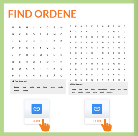 Indhold: Interaktivt element hvor eleverne skal finde ord og begreber fra historien.