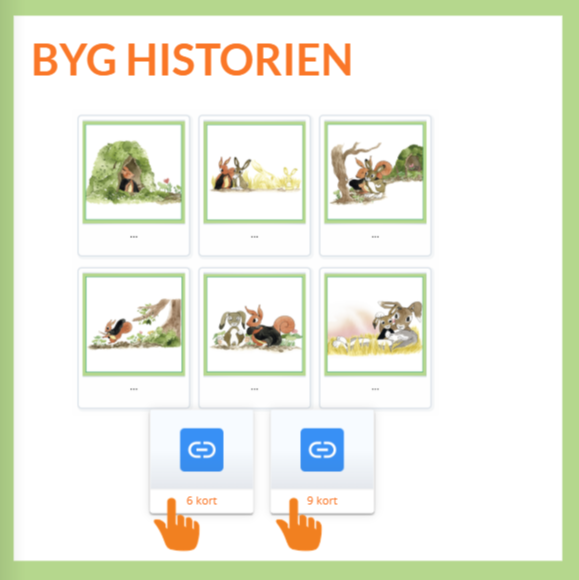 Indhold: Interaktivt element hvor eleverne skal placere billederne i rækkefølge og genskabe historien. Elementet findes i to versioner med henholdsvis 6 og 9 kort.