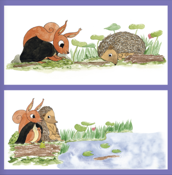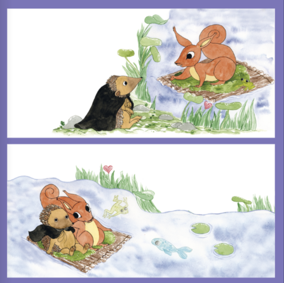 Vejledning: Eleverne skal digte små fortællinger om, hvad der sker andre gange, når Knirke og Pindsvin er ude og sejle på deres tømmerflåde.