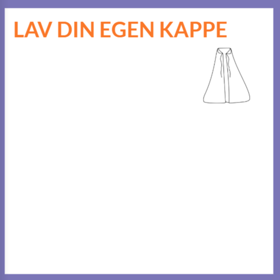 Vejledning: Eleverne skal lave deres egen fysiske kappe af f.eks. stof, avispapir eller lignende. De pynter kappen med noget, de godt kan lide (f.eks. fodbolde, hjerter, stjerner e.l.)Øvelsen kan laves individuelt, som makkerøvelse eller fælles i hele klassen, hvor der tages et samlet billede af alle eleverne med deres kapper.