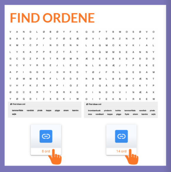 Vejledning: Eleverne skal finde ordene i nettet med bogstaver.