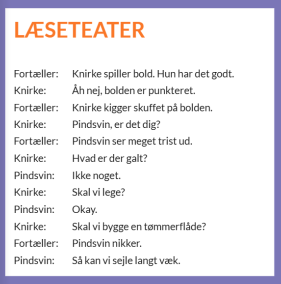 Læseteateret anvendes som fælles træning af oplæsning og som bearbejdning af fortællingens indhold. Aktiviteten understøtter elevernes læseforståelse, mundtlige sprogfærdigheder og indlevelse i tekstens univers.
