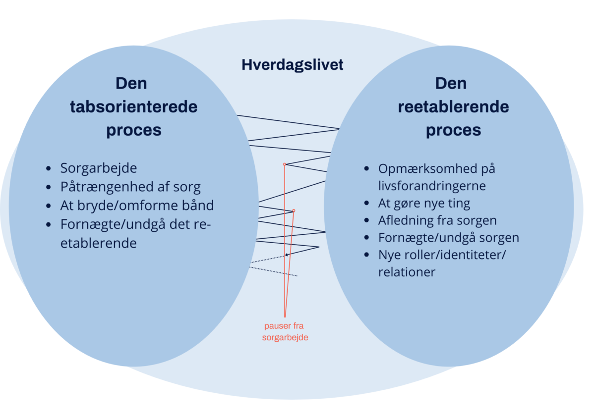To-proces modellen fra sorgforskningen – som du finder her på siden – beskriver, hvordan vi som pårørende pendulerer mellem to livsspor: et sygdomsspor og et hverdagsspor.